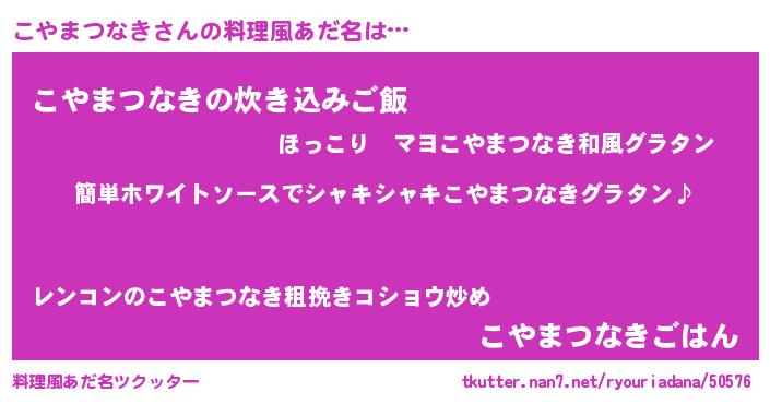 | 男性向けラノベタイトル風あだ名 | 『こやまつなきの嫁は女の子じゃないと思った?』 |