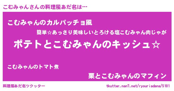 | 女子向けラノベタイトル風あだ名 | 『こむみゃんの卵を拾いまして』 |