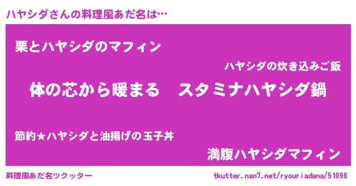 | ヘコむあだ名 | 『牛乳』『ハヤシダ(爆)』『ハヤ太郎』 |