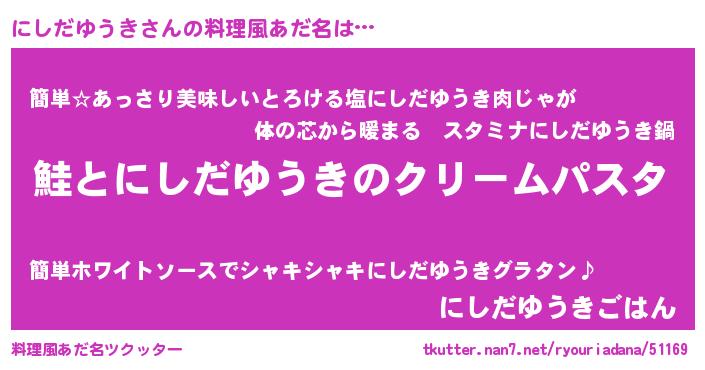 | ヘコむあだ名 | 『にしだゆうき(笑)』『酢こんぶ』 |