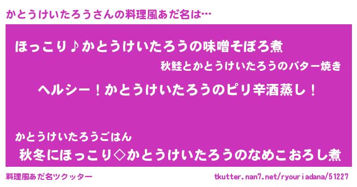 | ヘコむあだ名 | 『かとにー』『かとうけいたろう(笑)』 |