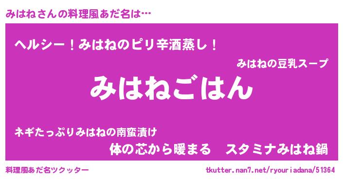 | 意味不明あだ名 | 『めかぶ科みはね属』『自称みはね』 |