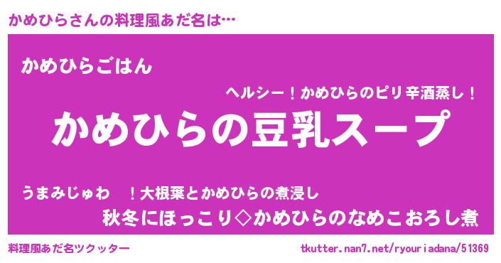 | 男性向けラノベタイトル風あだ名 | 『ダンジョンにかめひらを求めるのは間違っているだろうか』 |
