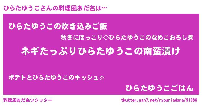 | ヒーロー風カッコイイあだ名 | 『スーパーヒラタユウコ』『天弓騎士ヒラ』 |