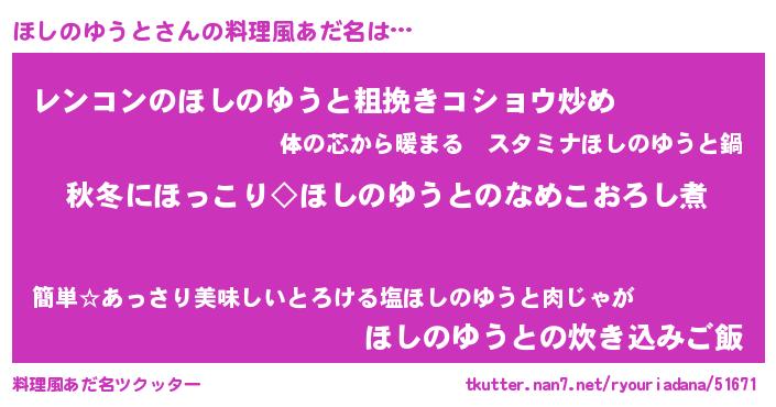 | 男性向けラノベタイトル風あだ名 | 『ほしのゆうとに滅ぼされるだけの簡単なお仕事です』 |