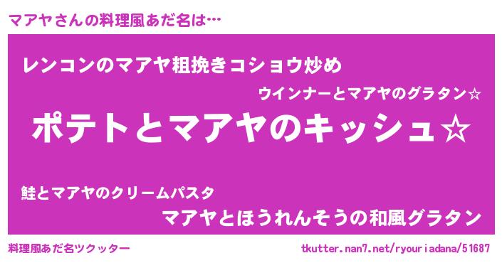 | 女子向けラノベタイトル風あだ名 | 『マアヤの卵を拾いまして』 |