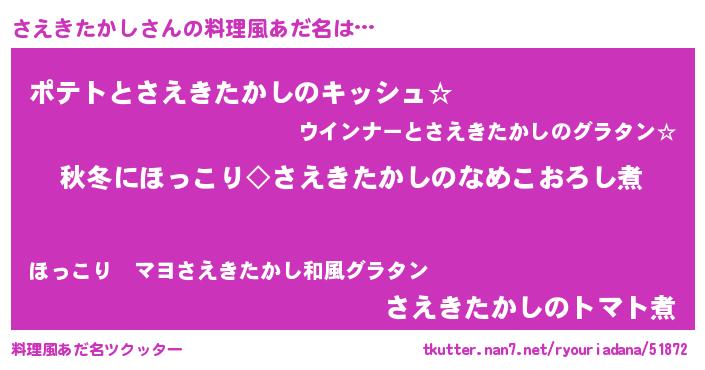 | 男性向けラノベタイトル風あだ名 | 『さえきたかしに滅ぼされるだけの簡単なお仕事です』 |