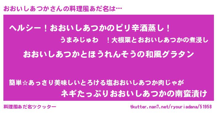 | 女子向けラノベタイトル風あだ名 | 『おおいしあつかの玉の輿計画!』 |