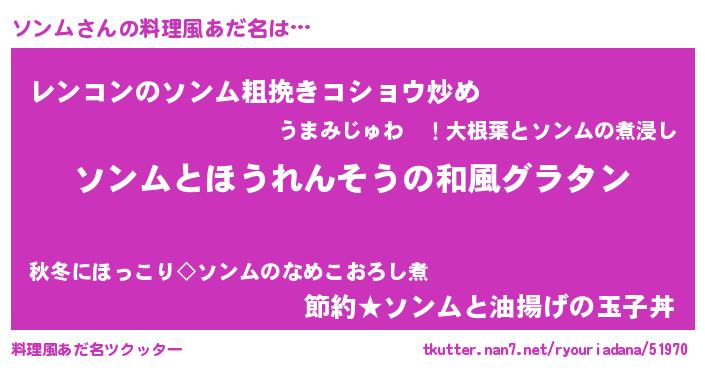 | 男性向けラノベタイトル風あだ名 | 『ソンム~年齢イコール彼女いない歴の魔法使い~』 |