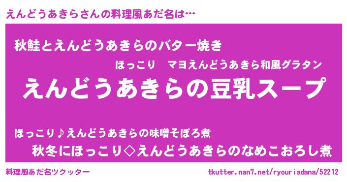 | 可愛いあだ名 | 『えっんぃー』『えんどうあきらママ』 |