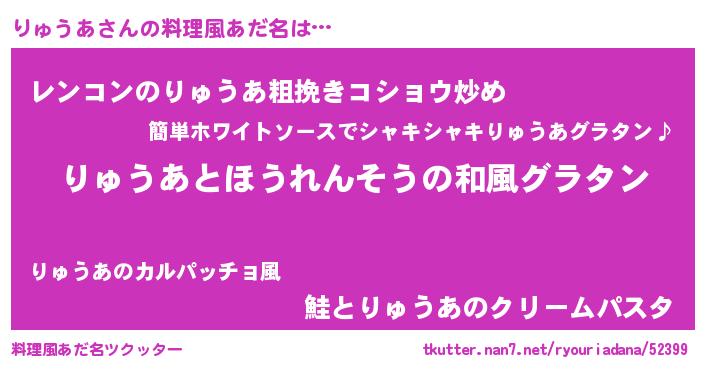 | 男性向けラノベタイトル風あだ名 | 『りゅうあ~年齢イコール彼女いない歴の魔法使い~』 |