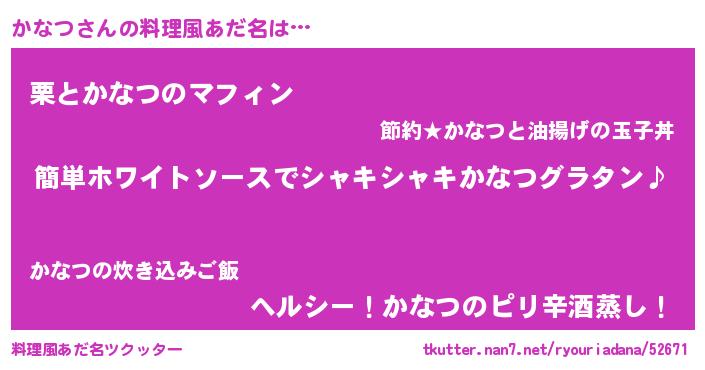 | 男性向けラノベタイトル風あだ名 | 『かなつの嫁は女の子じゃないと思った?』 |