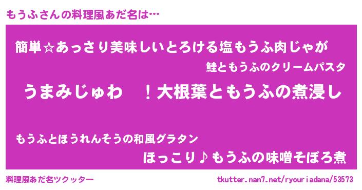 | 女子向けラノベタイトル風あだ名 | 『もうふの婚約者』『死神もうふの再婚』 |