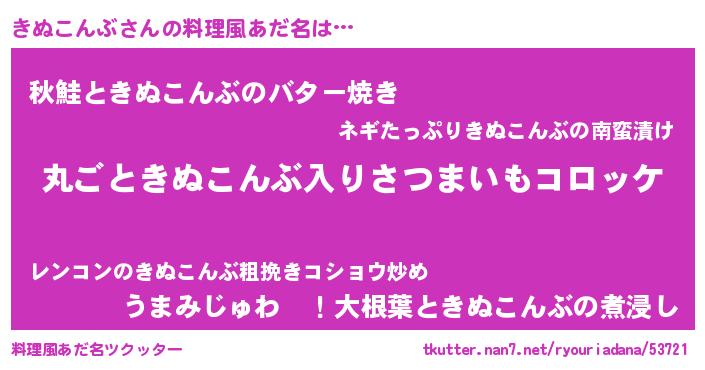| 女子向けラノベタイトル風あだ名 | 『乙女ゲームの破滅フラグしかない悪役きぬこんぶに転生してしまった…』 |