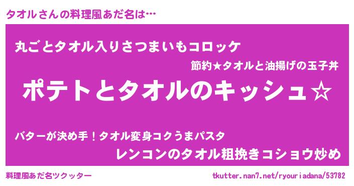 | 女子向けラノベタイトル風あだ名 | 『タオルの卵を拾いまして』 |