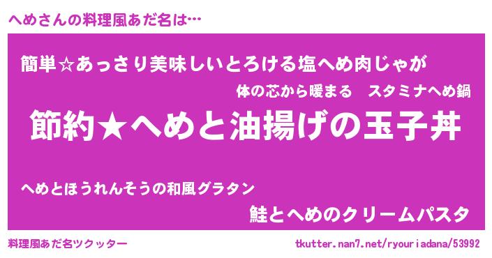 | 女子向けラノベタイトル風あだ名 | 『へめ姫と円卓の騎士』『死神へめの再婚』 |