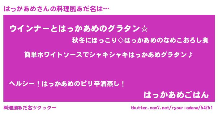 | 男性向けラノベタイトル風あだ名 | 『はっかあめの嫁は女の子じゃないと思った?』 |