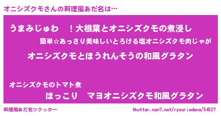 | 男性向けラノベタイトル風あだ名 | 『オニシズクモ~年齢イコール彼女いない歴の魔法使い~』 |