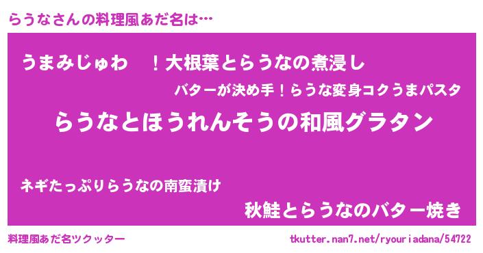 | 女子向けラノベタイトル風あだ名 | 『らうなの玉の輿計画!』『らうな恋絵巻』 |
