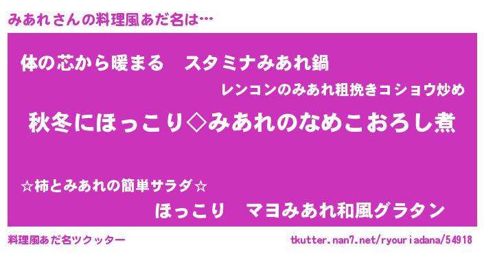 | ヘコむあだ名 | 『レバニラ』『みあお』『みあにゅー』 |