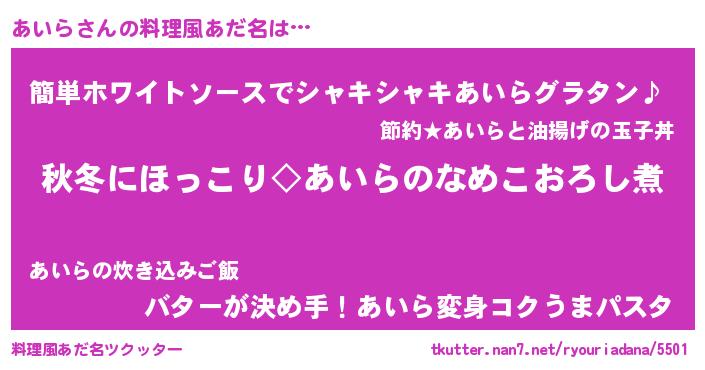 | 意味不明あだ名 | 『とにかく怪しいあいら』『自称あいら』 |