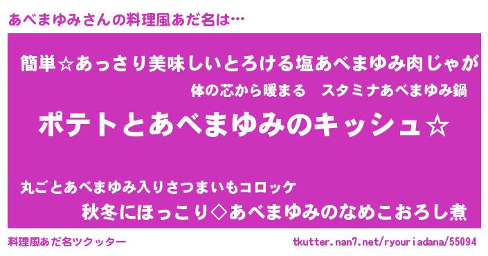 | ポケモン風あだ名 | 『ヒアベマユミ』『ゼニアベ』 |