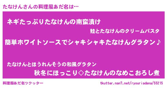 | 男性向けラノベタイトル風あだ名 | 『たなけんの嫁は女の子じゃないと思った?』 |