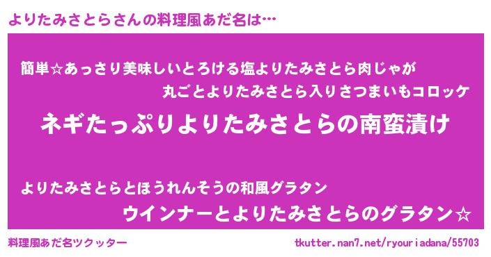| 胡散臭い通販商品みたいなあだ名 | 『億万長者になれるブレスレット…その名も「よりたみさとら」』 |