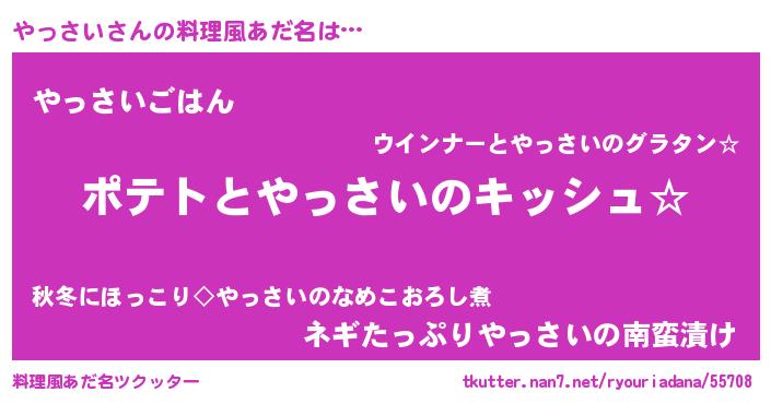| 男性向けラノベタイトル風あだ名 | 『やっさいの嫁は女の子じゃないと思った?』 |