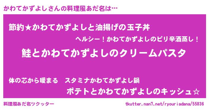 | 男性向けラノベタイトル風あだ名 | 『ノーゲーム・ノーカワテカズヨシ』 |