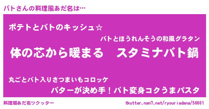 | 女子向けラノベタイトル風あだ名 | 『バトの雑貨屋さん』『バト恋絵巻』 |