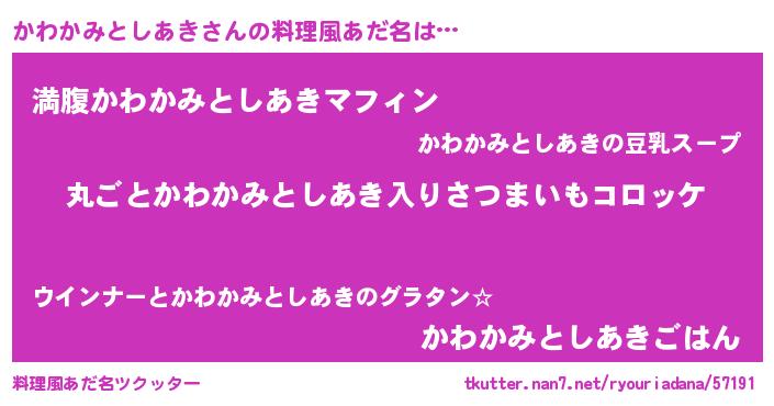 | 男性向けラノベタイトル風あだ名 | 『この素晴らしい世界にかわかみとしあきを!』 |
