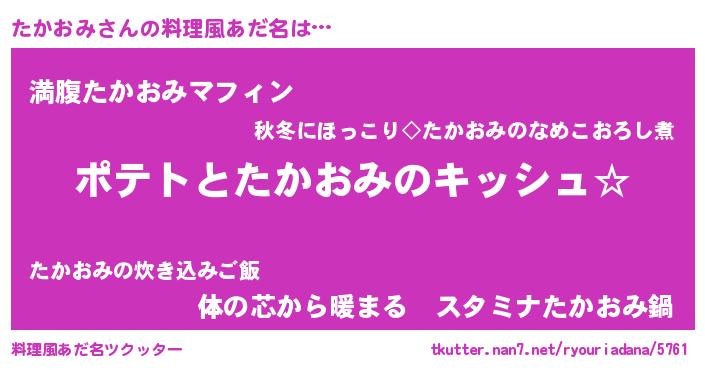 | 女子向けラノベタイトル風あだ名 | 『たかおみの卵を拾いまして』 |