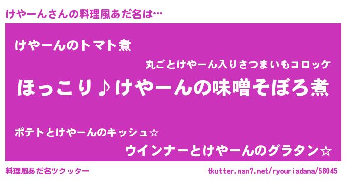 | 男性向けラノベタイトル風あだ名 | 『けやーんの憂鬱』『魔弾の王とけやーん』 |