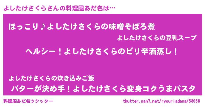 | 男性向けラノベタイトル風あだ名 | 『Re:よしたけさくらから始める異世界生活』 |