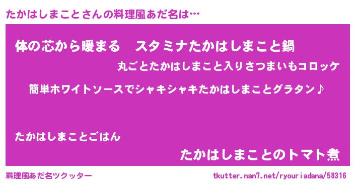 | ポケモン風あだ名 | 『ヒタカハシマコト』『タカハダネ』 |