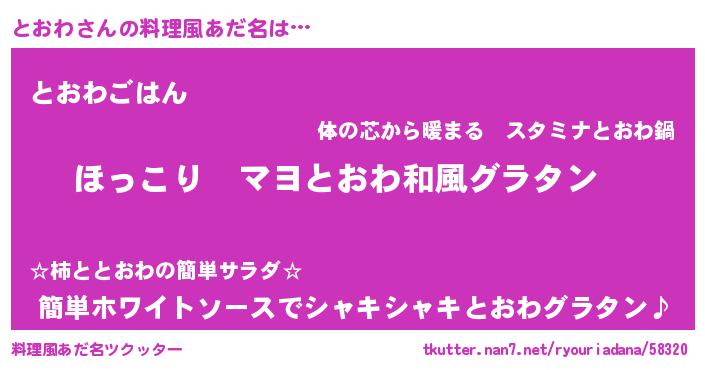 | 男性向けラノベタイトル風あだ名 | 『この素晴らしい世界にとおわを!』 |