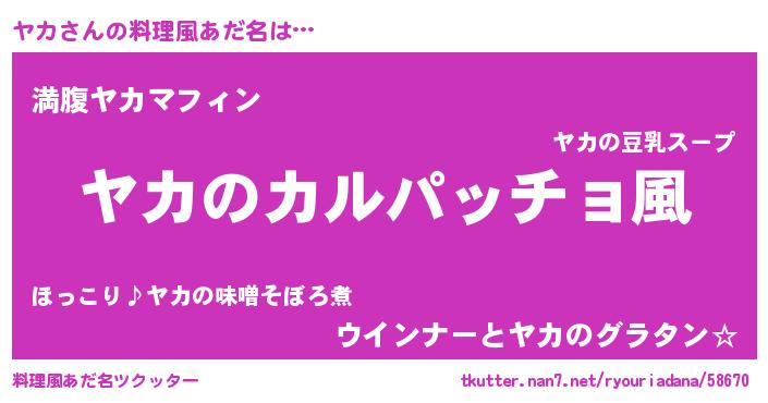 | 男性向けラノベタイトル風あだ名 | 『魔弾の王とヤカ』『ヤカの憂鬱』 |
