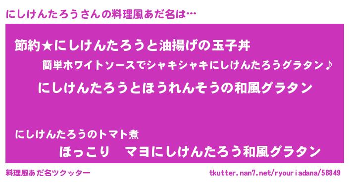 | 男性向けラノベタイトル風あだ名 | 『にしけんたろう~年齢イコール彼女いない歴の魔法使い~』 |