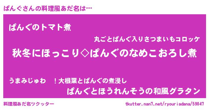 | 男性向けラノベタイトル風あだ名 | 『ぱんぐに滅ぼされるだけの簡単なお仕事です』 |
