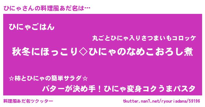 女子向けラノベタイトル風あだ名 | 『横柄ひにゃと宰相陛下』『ひにゃ恋絵巻』 |