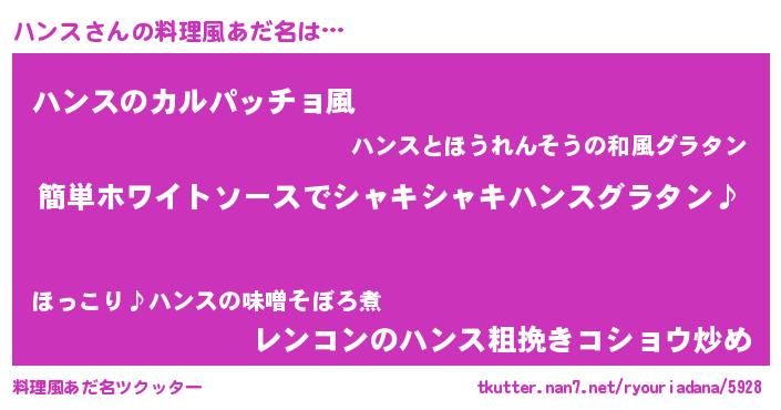 | 男性向けラノベタイトル風あだ名 | 『ハンスの嫁は女の子じゃないと思った?』 |