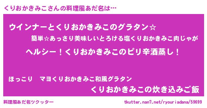 | 男性向けラノベタイトル風あだ名 | 『Re:くりおかきみこから始める異世界生活』 |