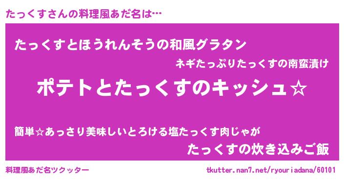 | 女子向けラノベタイトル風あだ名 | 『たっくすの卵を拾いまして』 |