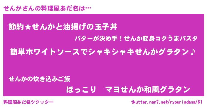 | ヘコむあだ名 | 『せんを』『せんにゅー』『なまこ酢』 |