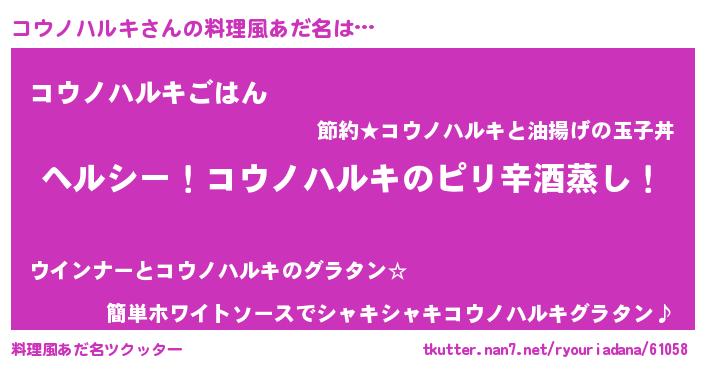 | 男性向けラノベタイトル風あだ名 | 『Re:コウノハルキから始める異世界生活』 |
