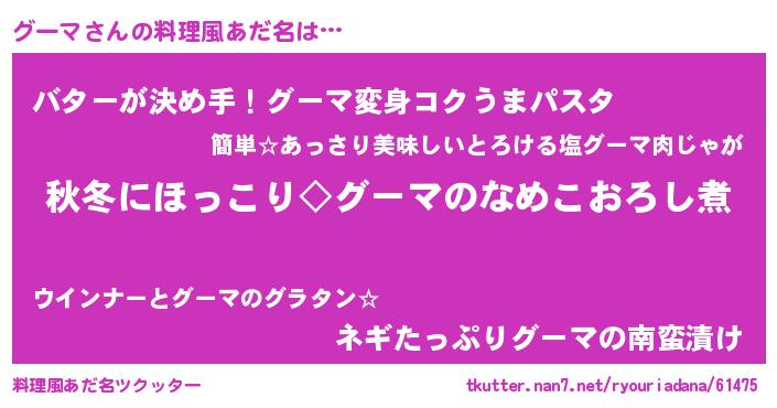 | 男性向けラノベタイトル風あだ名 | 『グーマに滅ぼされるだけの簡単なお仕事です』 |