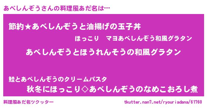 | 女子向けラノベタイトル風あだ名 | 『あべしんぞうの玉の輿計画!』 |