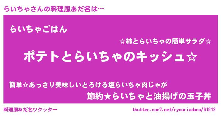 | 女子向けラノベタイトル風あだ名 | 『らいちゃの卵を拾いまして』 |