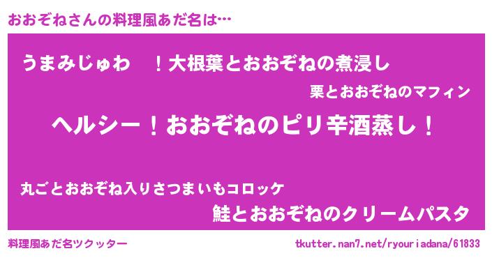 | 男性向けラノベタイトル風あだ名 | 『Re:おおぞねから始める異世界生活』 |